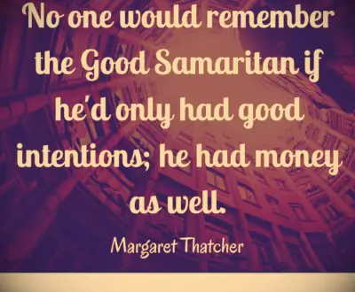 Niemand zou zich de goede Samaritaan herinneren als hij alleen maar goede bedoelingen had gehad; Hij had ook geld. -Margaret Thatcher