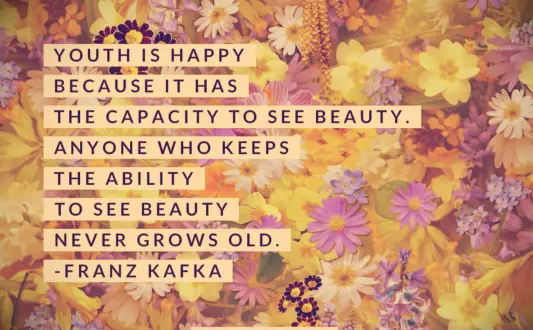 Jeugd is blij omdat het de capaciteit heeft om schoonheid te zien. Iedereen die de mogelijkheid houdt om schoonheid te zien, wordt nooit oud. - Franz Kafka