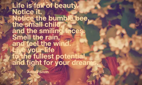 Het leven is vol schoonheid. Let op. Let op de Bumble Bee, het kleine kind en de glimlachende gezichten. Ruik de regen en voel de wind. Leef je leven ten volle potentieel en vecht voor je dromen. - Ashley Smith