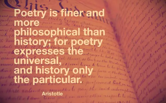 Poëzie is fijner en filosofischer dan geschiedenis; Want poëzie drukt de universele en geschiedenis alleen uit. - Aristoteles